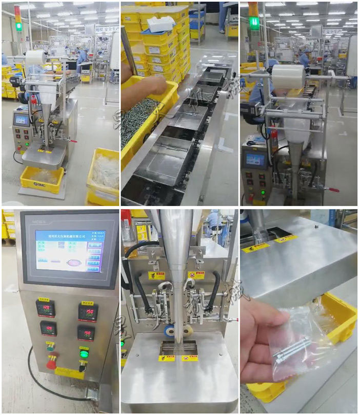 螺絲釘全自動(dòng)包裝機(jī)-零件包裝機(jī)應(yīng)用現(xiàn)場(chǎng)-設(shè)備細(xì)節(jié)和螺絲釘樣品展示