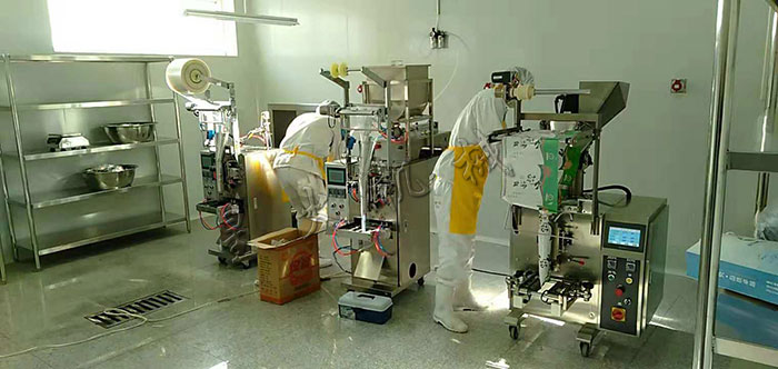 北京呀咪呀咪食品有限公司車間-液體調料包裝機(左)-調料醬自動包裝機(中)-全自動調料粉劑包裝機(右)應用現(xiàn)場